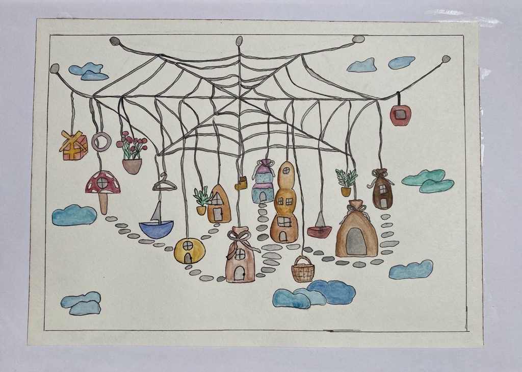 The third work shows a fantasy world built around a spiderweb, drawn with fineliner and watercolor. It was all about imagination and playful design.