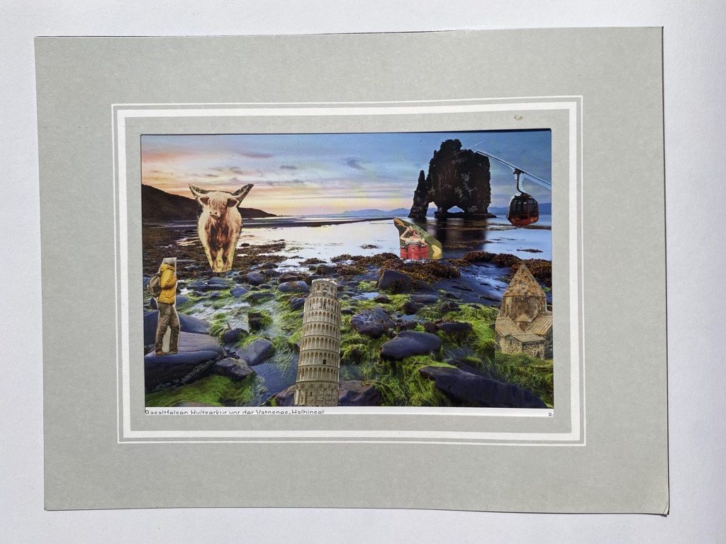 The first one is a surreal collage made from cut-out photos, combining landscapes with unexpected objects and figures to tell a new visual story.